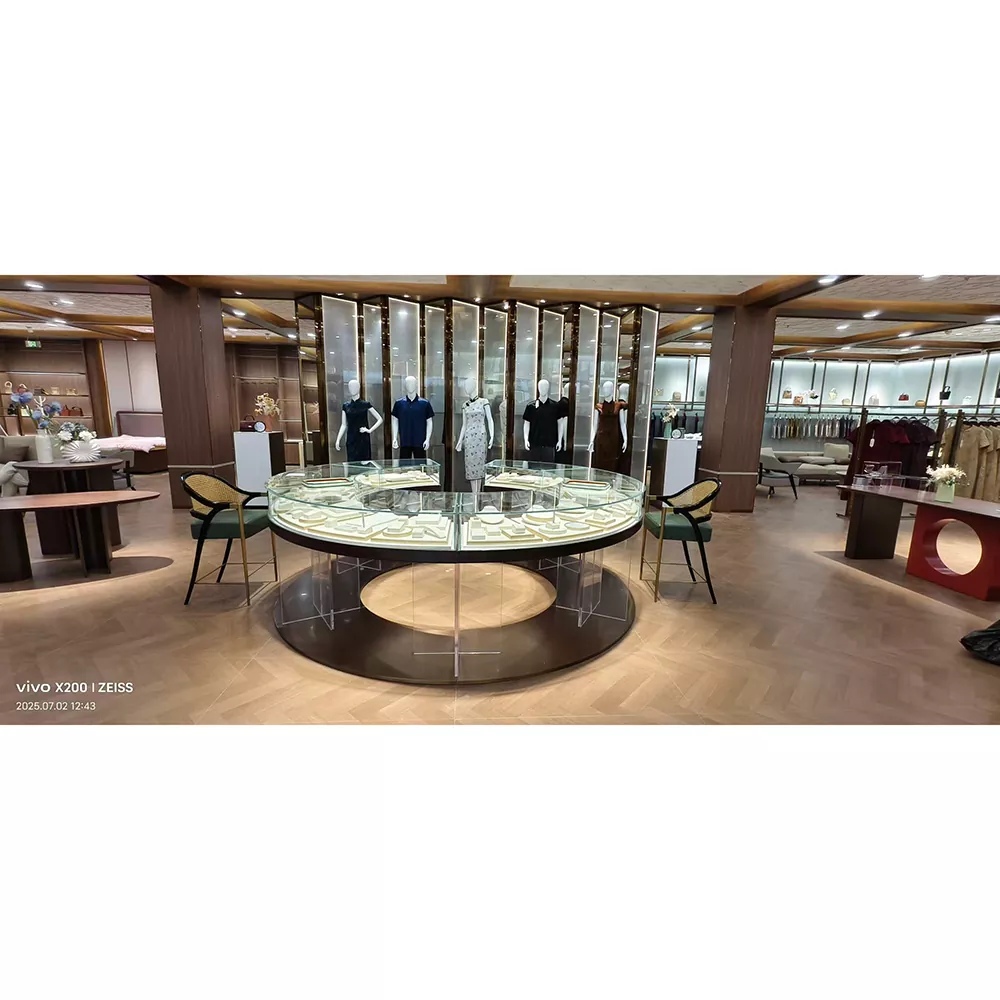 O expositor de roupas femininas de vidro é feito de material de vidro premium, apresentando uma aparência requintada e refinada. Sua transparência permite uma clara visibilidade das mercadorias expostas, atraindo a atenção dos clientes. O estilo de design distinto combina a simplicidade moderna com um senso de moda, realçando o gosto geral e o ambiente da loja.