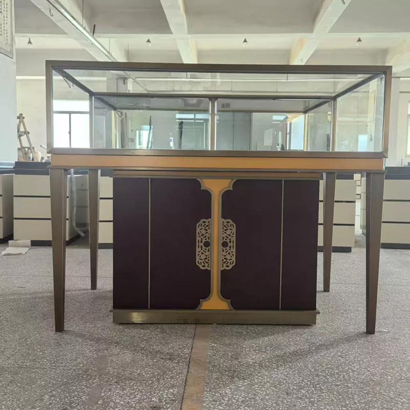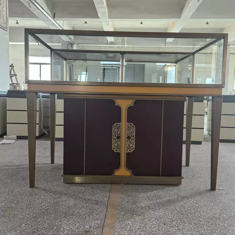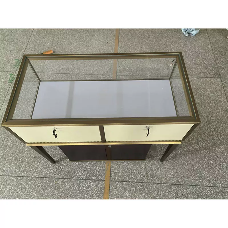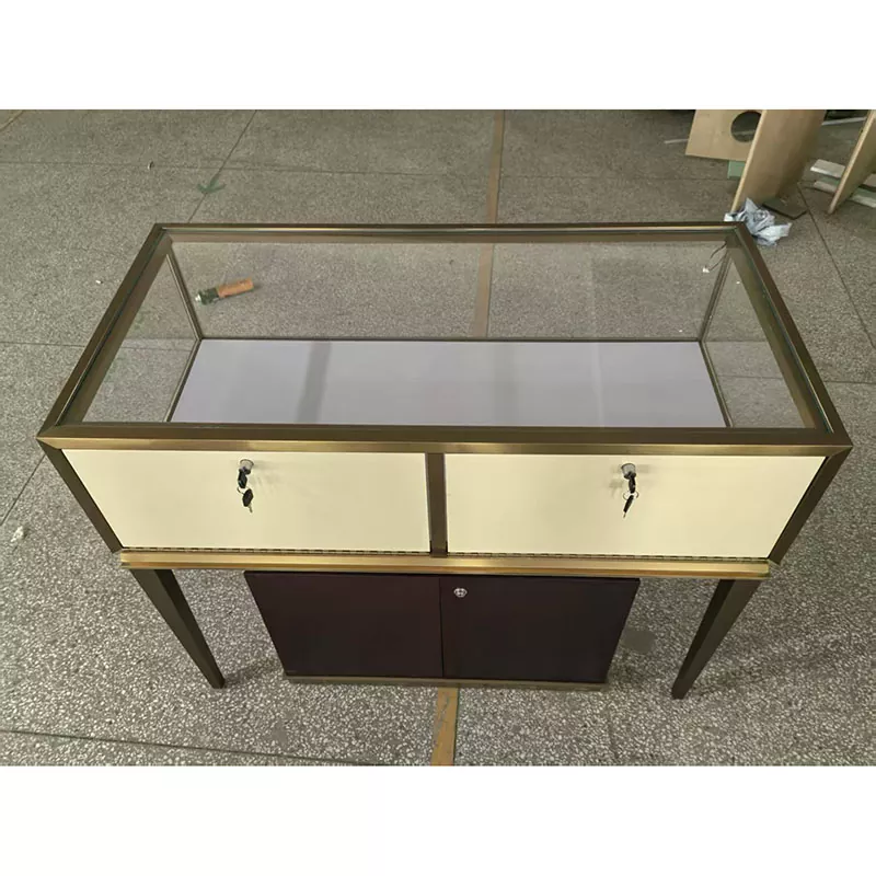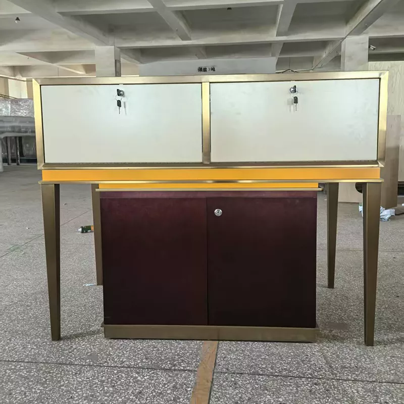 Os balcões das marcas no shopping, como os que vendem relógios e óculos, ficam particularmente requintados com esta mesa.